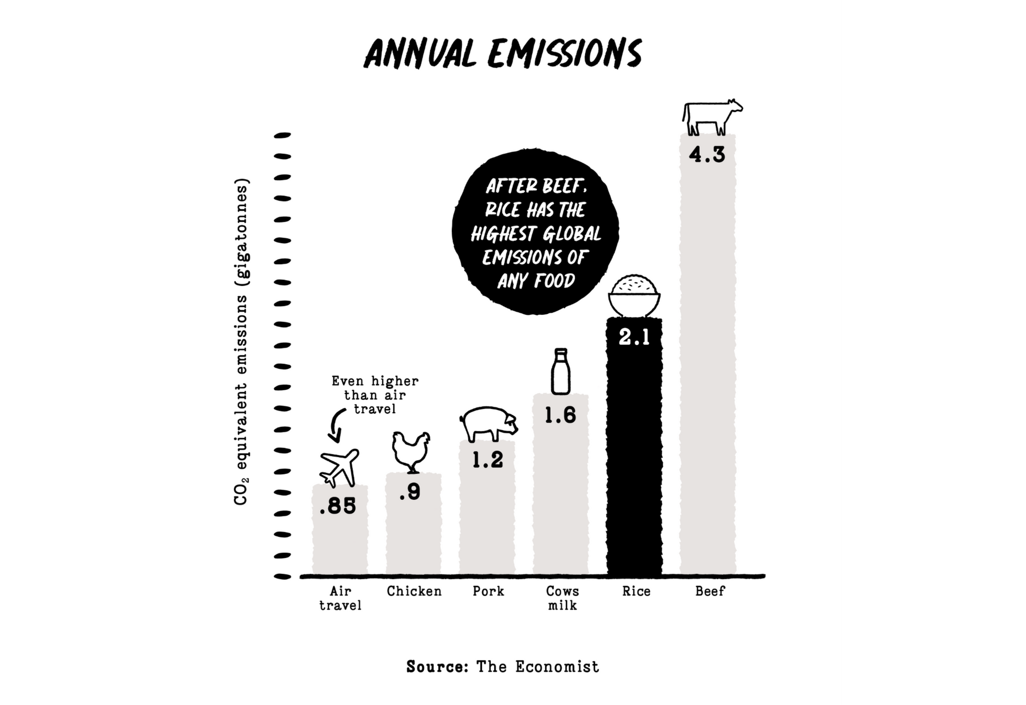 As someone who eats a lot of rice at home, I was shocked to learn that rice has the second highest emissions footprint of any food globally - only beef is worse. My curiosity led me to dive deeper into the reasons behind this, so I started learning about rice farming. I discovered that most rice is grown in a way that uses a huge amount of water and produces methane – a powerful ‘greenhouse’ gas.